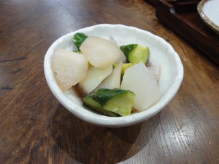 かるく塩茹でした大根の乱切りと塩で板ずりしたきゅうりの乱切りを漬けました。