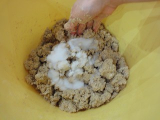上のぬかと麹にお湯600CCを入れてどんどんとかき混ぜます。